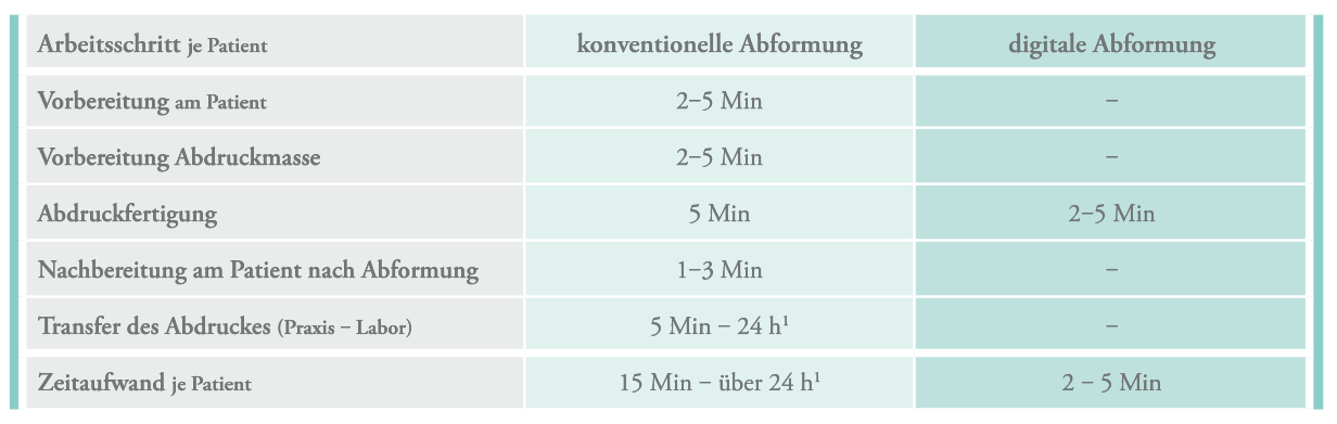 Selbstverständlich ist diese Aufstellung nicht exakt auf Ihre Praxis anwendbar, doch egal wie effizient Sie arbeiten, es benötigt zumeist 2 Fachkräfte für die zu erledigenden Arbeiten. Zusätzlich empfinden viele Patienten die Abdrucknahme höchst unangenehm, bis hin zu Brechreiz auslösend. Eine Unannehmlichkeit, die zusätzlich zu dem Mehraufwand vermeidbar ist.